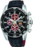 Seiko , Going where you go, providing utility for everyday life, the Sportura collection. Stainless steel case measures 44mm diameter by 12mm thick. Genuine leather strap includes a convenient buckle. Black dial with luminous white hands and hour markers. Alarm and chronograph sub dials. Date display at the fourth hour. The scratch resistant sapphire crystal protects the water resistant to 100 meters case. A precise Quartz movement rests in the heart of this sturdy timepiece. ...